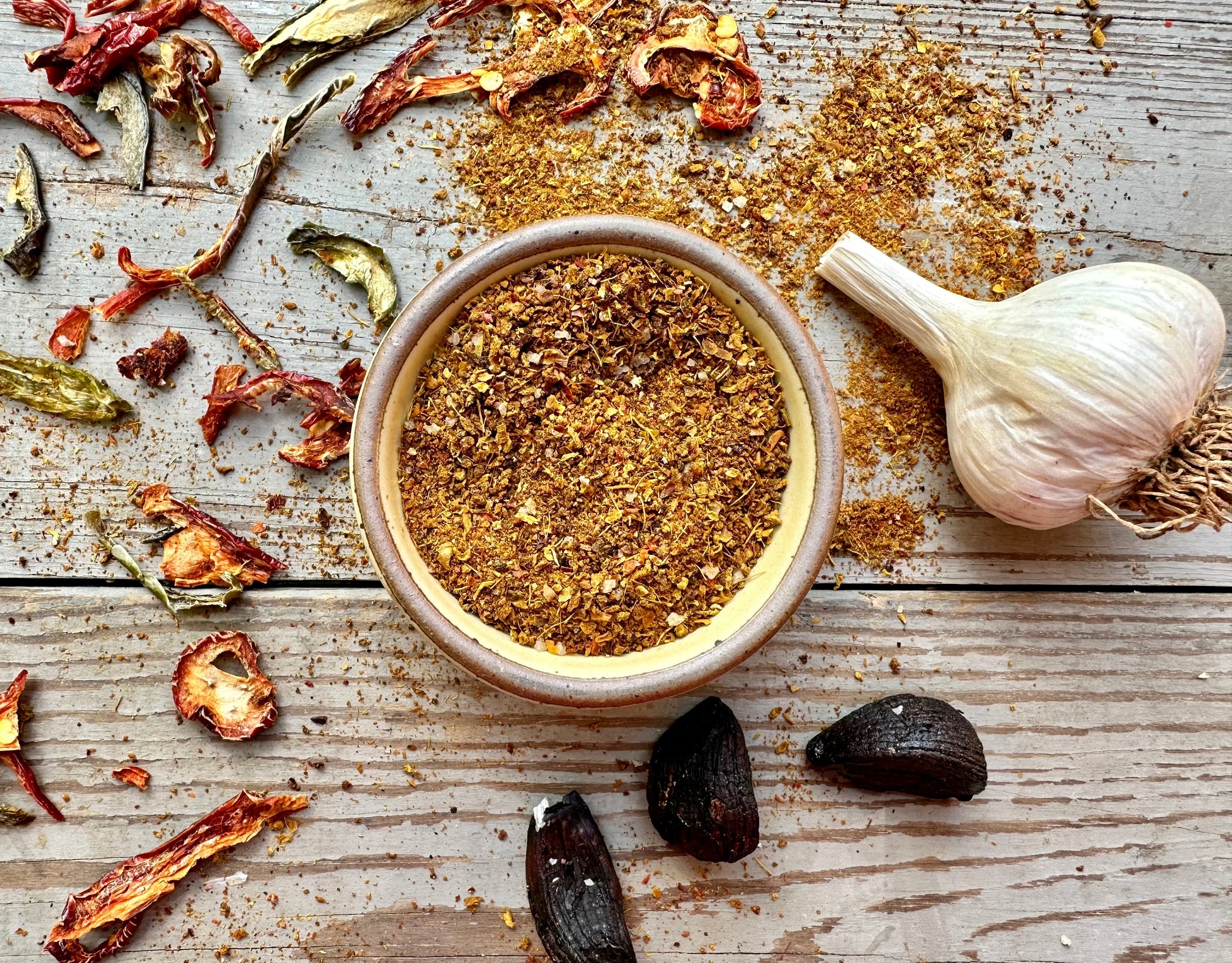 We take locally grown hot peppers, onions, and garlic and cold-smoke them with sun-ripened tomatoes, black garlic, and fire cider mash from Pure Fire Foods. This seasoning is bursting with smoky North Carolina magic!