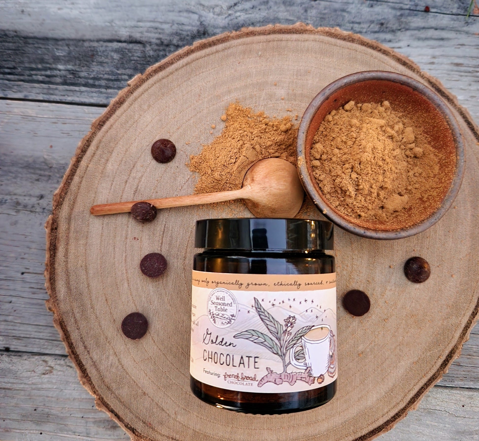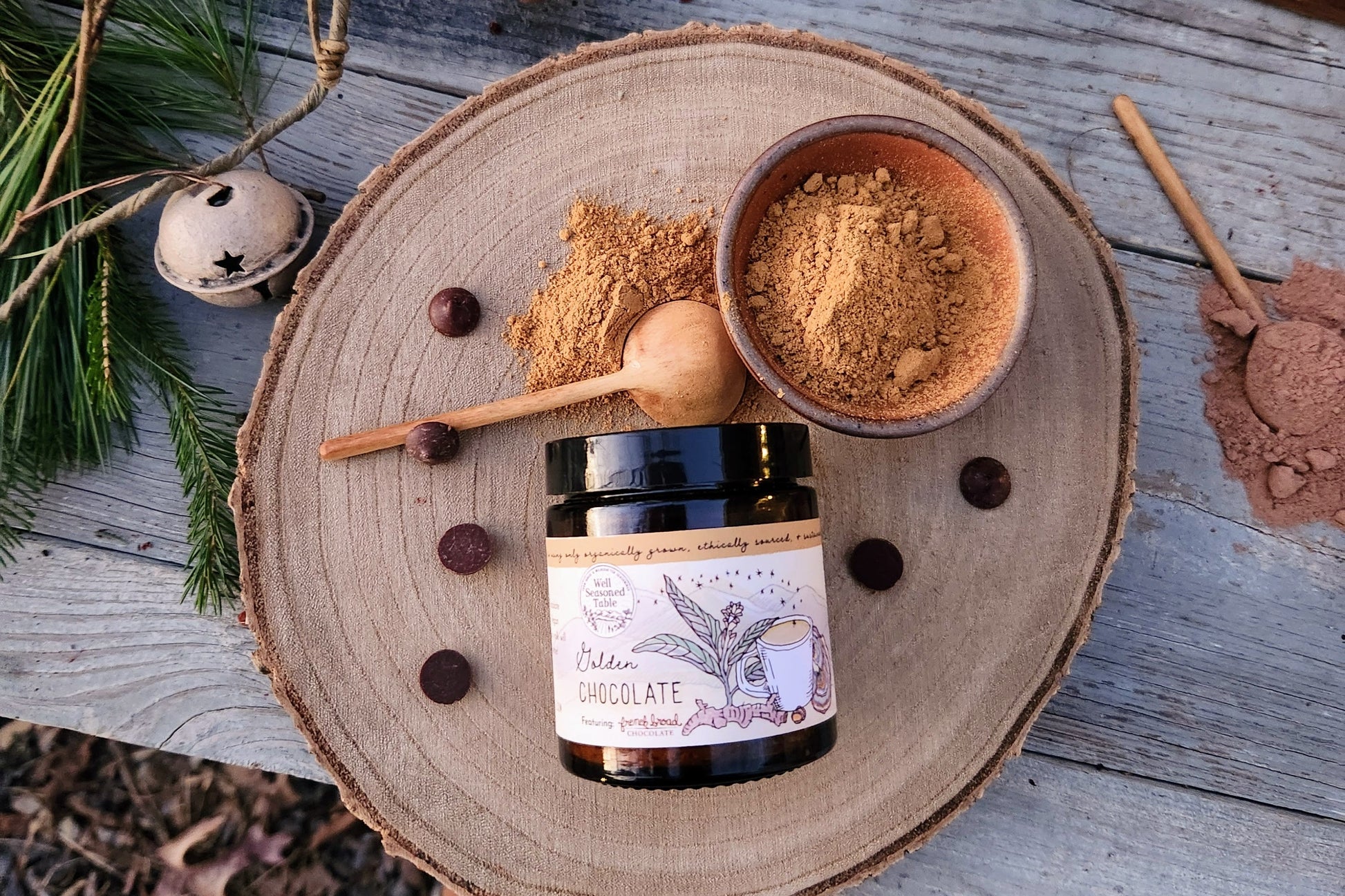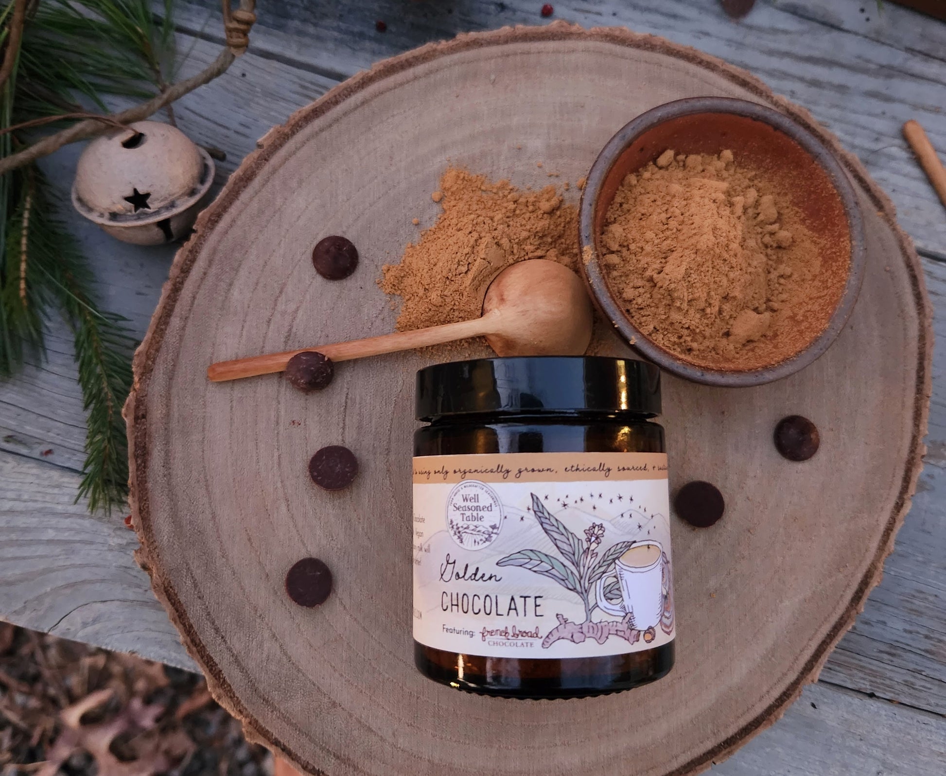 Ingredients: French Broad Chocolate’s roasted cacao, molasses sugar, turmeric, dark chocolate chips (unsweetened chocolate, cane sugar, cocoa butter, soy lecithin, vanilla extract, milkfat), cane sugar, wildcrafted Ganoderma tsugae (Hemlock Reishi), cinnamon, nutmeg, cayenne pepper, black pepper, Celtic Sea Salt®, turkey tail mushroom, ginger.