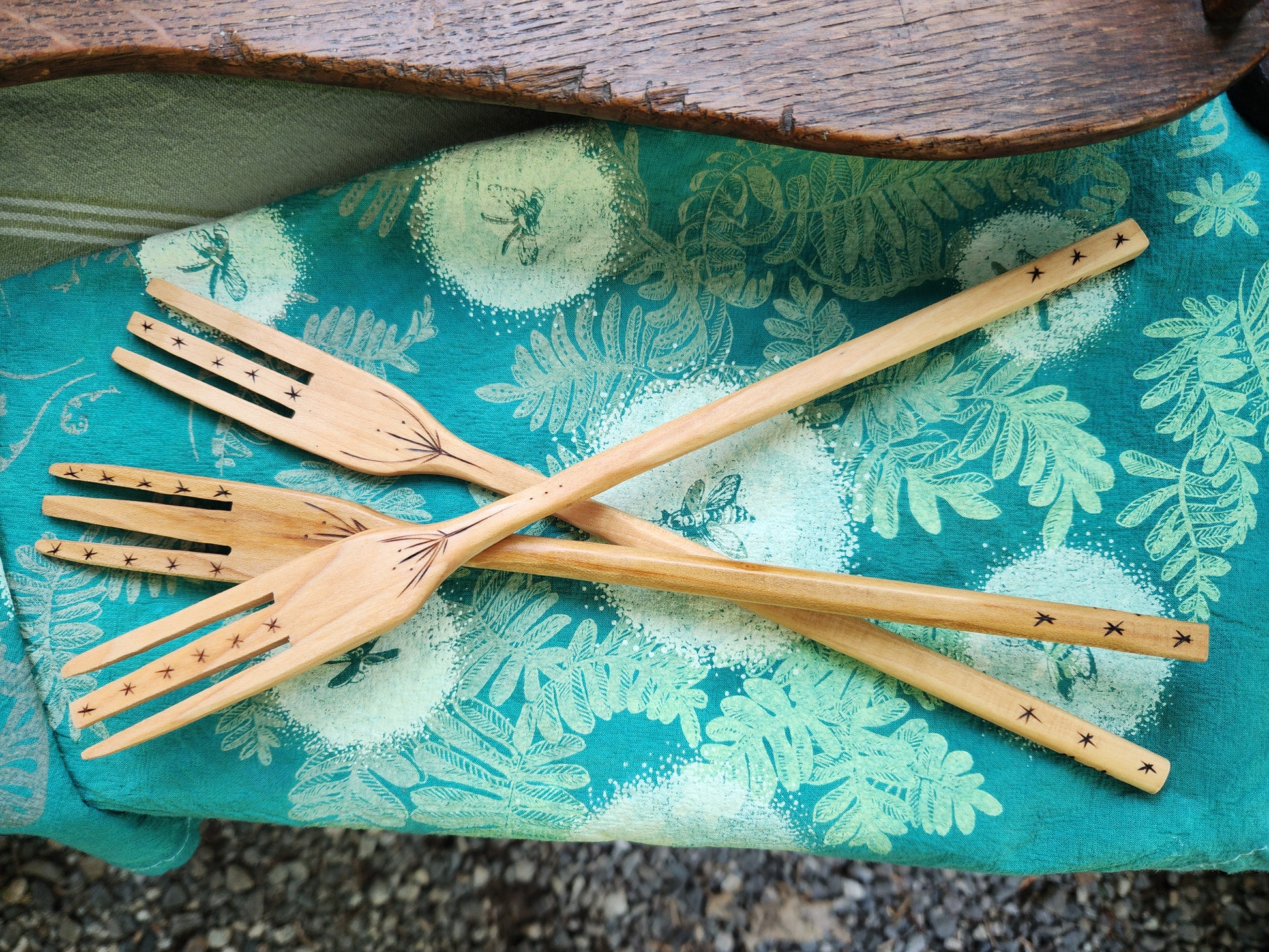 From the woodshop on the farm (CatBike Studios) we bring you this beautifully crafted farm-style Wooden Fork, wood-burned with Well Seasoned Table illustrations